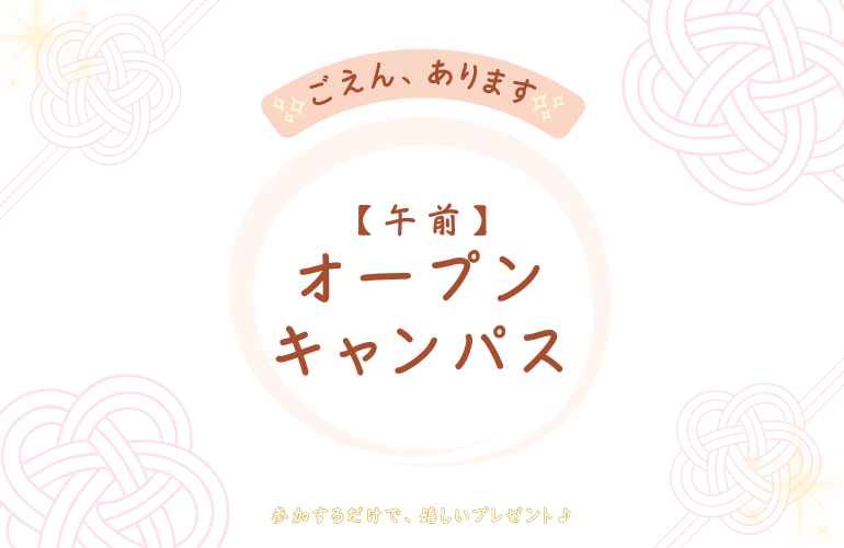 オープンキャンパス【午前】10:30~12:30 体感授業のないオープンキャンパスです! ※体感授業はオープンキャンパス【午後】で実施します。 <受付時間10:00~10:20> ■学園キャンパスムービー ■在学生の声 ■トピックス ■学科・コース内容説明 ■公務員合格状況 ■入学方法 ■なんでも質問コーナー ■施設見学